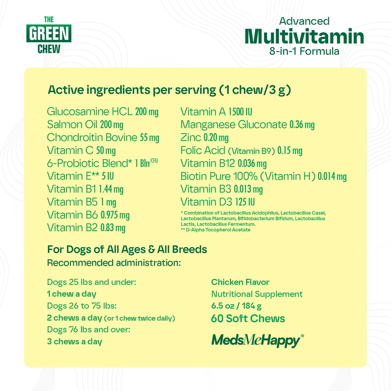 Our 8-in-1 Daily Multivitamin for Dogs is packed with essential vitamins, minerals, and functional ingredients that work together to support total-body wellness.